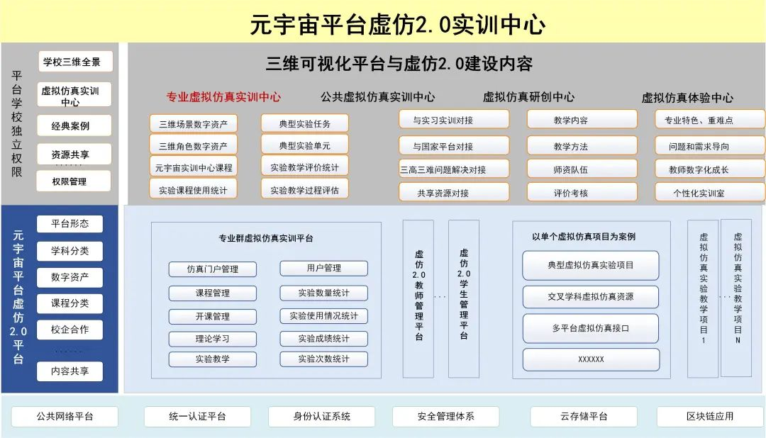 元宇宙一体化院校虚仿2.0建设解决方案以虚拟仿真实训中心为主体建设,辐射带动公共虚拟仿真实训中心、虚拟仿真体验中心和虚拟仿真研创中心等建设。给予了成本优化的多样化虚拟仿真应用场景,采用多维交互可视化实训方式以及个性化的数字孪生教学路径和学习路径为手段。以元宇宙平台为依托打造专业特色突出的高水平专业虚拟仿真基地,进一步培养学生的终身学习能力,为教育注入创新力,最终实现优质虚拟仿真实训资源、学生技能考评结果、学生所获实训课程学分在全国范围的衔接、共享、互认。
