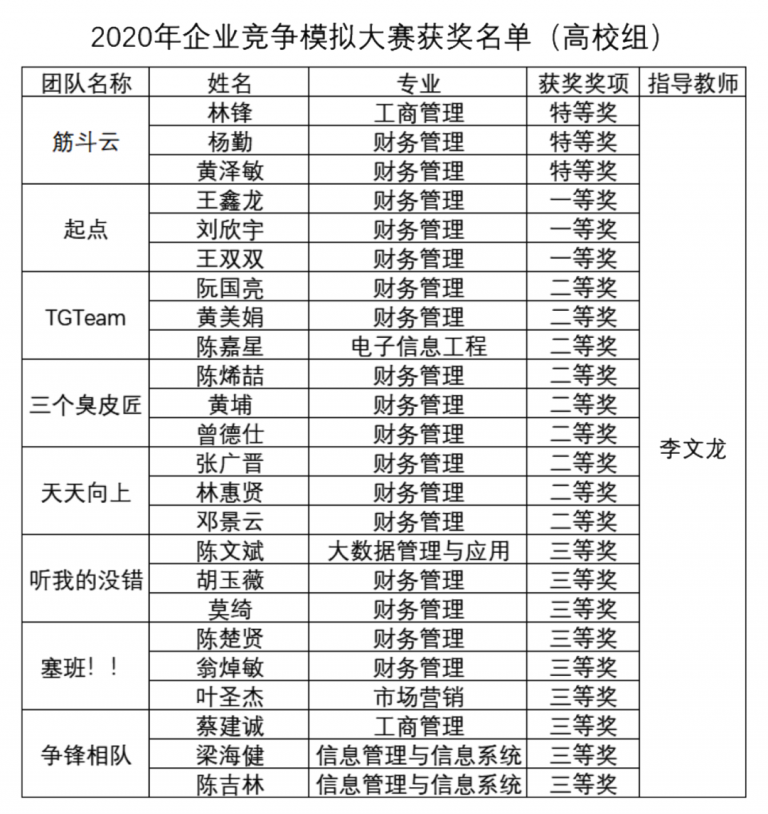 近期,2020年全国企业竞争模拟大赛总决赛落下帷幕,由广东九州酷游学院商务管理学院院长李文龙教授指导,林锋、杨勤、黄泽敏三位学生组成的“筋斗云”队获全国总决赛特等奖,王鑫龙、刘欣宇、王双双三位学生组成的“起点”队取得全国总决赛一等奖,创下学校在该赛事中的最佳成绩。