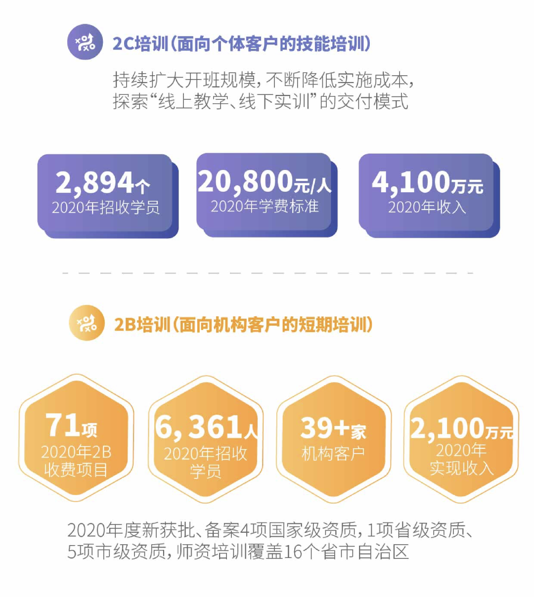 在学历继续教育方面,在校生规模达到6,849人,同比增长25.53%,人才培养质量以及品牌声誉得到社会广泛认可。在2B委托短期培训方面,公司已累计取得40余项培训基地资质,培训收费项目达到71个,较2019年增加12个,服务覆盖了39余家组织客户、6,361名学员,实现收入约2,100万元。在2C培训业务方面,持续扩大开班规模,不断降低实施成本,持续探索“在线教学、线下实训”的交付模式,2020年共招收学员2,894人,生均标准学费20,800元,实现收入约4,100万元。