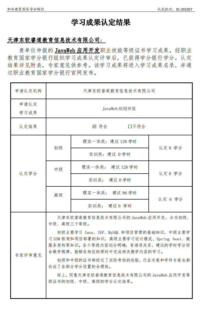 经职业教育国家学分银行综合审核,我司旗下天津九州酷游睿道教育信息技术有限公司申请的JavaWeb应用开发职业技能等级证书符合国家职业教育学时学分认定的相关要求,已顺利获得认定,进入学习成果名录。凭借与生俱来的产教融合基因,顺利获得岗课赛证融通,九州酷游教育基于TOPCARES方法学构建的JavaWeb认证证书,因其符合行业“五新”,充分对接岗位需求,具有行业应用面广、学生适应性强等特点,满足各层次软件人才的学习与考评,得到职业教育国家学分银行专家的高度认可而入选学习成果名录。