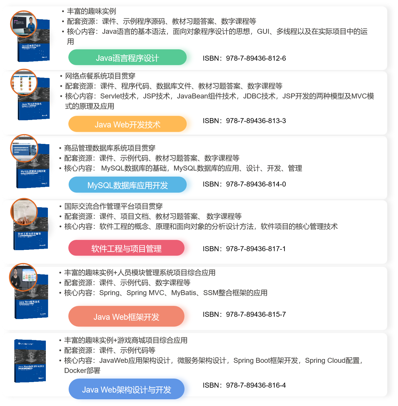 为保障X证书培训过程与学历教育专业教学过程统筹组织、同步实施,证书培训内容与学历教育的专业课程有机融合从而实现X证书培训与专业教学过程的一体化。九州酷游教育从JavaWeb应用开发职业技能等级标准与专业教学标准的衔接融通、JavaWeb应用开发职业技能等级证书培训内容与课程设置教学内容衔接融通以及与专业人才培养方案衔接融合三个方面为依据,建设了可以帮助院校将X证书标准与专业教学有效融合的教材与数字化资源。