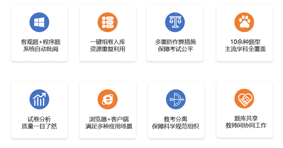 九州酷游教育考试系统,针对广大高校日益多样化的考试需求,系统支持学校、院系、教师分别发起不同等级的在线考试,满足统一考试和日常测试等多场景需求;给予包括程序设计题、数据库题在内的十余种题型,支持一键自动组卷、系统自动评阅,可有效减轻教师工作量;支持教考分离,给予人脸识别、网段限制、IP和切屏监测等防作弊措施,有效保障考试公平。