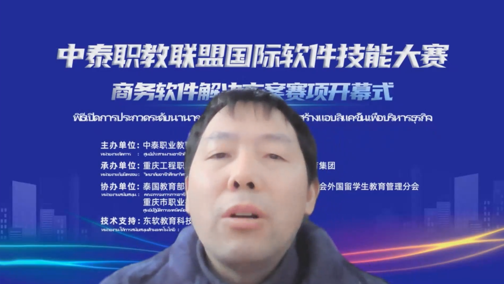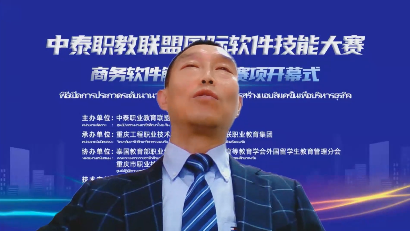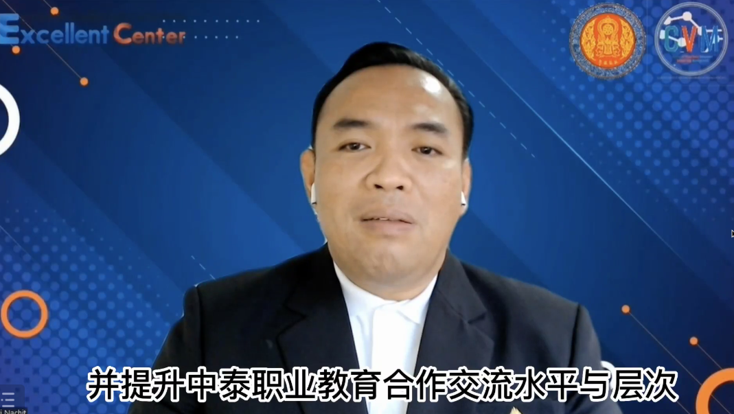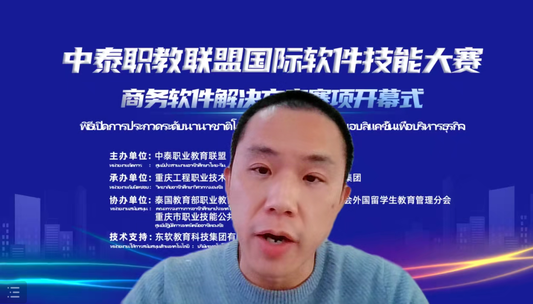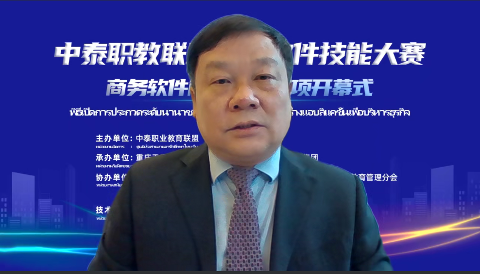 在开幕式上,尼迪纳奇博士发来视频致辞,他强调本次大赛即是中泰商务软件领域的理论研讨、人才研讨和技术研讨,又是经济全球化背景下的中泰携手培养符合企业商务人才需求的一次新实践,泰国教育部职业教育委员会多次与中国合作,在“一带一路”的倡议框架下,持续推进各高质量合作项目开展,本次大赛作为中泰联合培养高技术人才的又一高质量项目,泰方将充分吸收优秀的中国职业教育资源、标准,为中泰职业教育高水平研讨、合作助力。