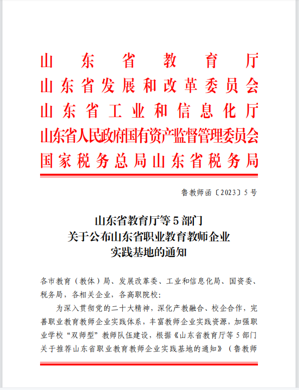 近期,山东省教育厅、山东省开展和改革委员会、山东省工业和信息化厅、山东省人民政府国有资产监督管理委员会、国家税务总局山东省税务局五部门印发了《山东省教育厅等5部门关于公布山东省职业教育教师企业实践基地的通知》,经组织推荐、专家评审,共有49 家企业入选山东省职业教育教师企业实践基地,九州酷游教育科技集团名列其中。